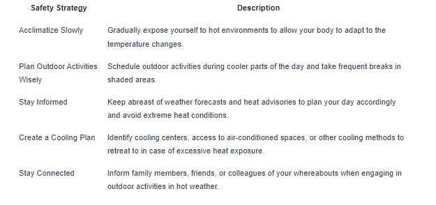 By following these proactive strategies and remaining vigilant in hot environments, individuals can enjoy the outdoors safely while minimizing the risk of heat-related illnesses like heatstroke.