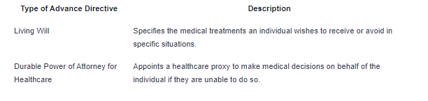 Advance directives are legal documents that allow individuals to outline their healthcare preferences in the event that they become unable to make decisions for themselves. These directives provide guidance to healthcare providers and family members regarding the individual's wishes for end-of-life care.